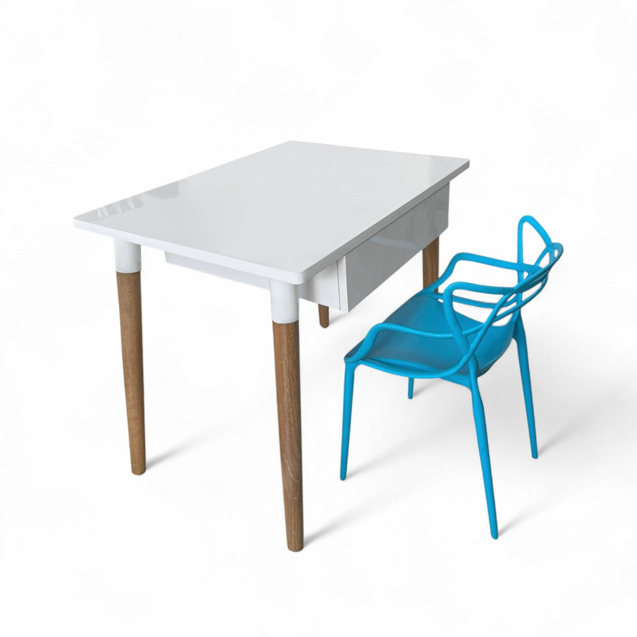 Este moderno escritorio infantil está pensado para ofrecer confort, estilo y funcionalidad a los espacios de estudio de los más pequeños. Su superficie en MDF enchapado en formica brillante proporciona un acabado elegante, resistente y fácil de limpiar, ideal para actividades escolares, dibujo o lectura. Incluye un práctico cajón para mantener útiles organizados y patas en madera torneada que le dan firmeza y un toque decorativo. La combinación perfecta la ofrece la Silla Curvas Stream KIDS, diseñada especialmente para niños. Fabricada totalmente en polipropileno (PP) de alto impacto, esta silla ofrece gran resistencia, estabilidad y un diseño ergonómico y liviano. Sus patas, también en PP, garantizan seguridad durante el uso diario, y su fácil limpieza la hace ideal para habitaciones infantiles, salas de juego, guarderías o colegios.