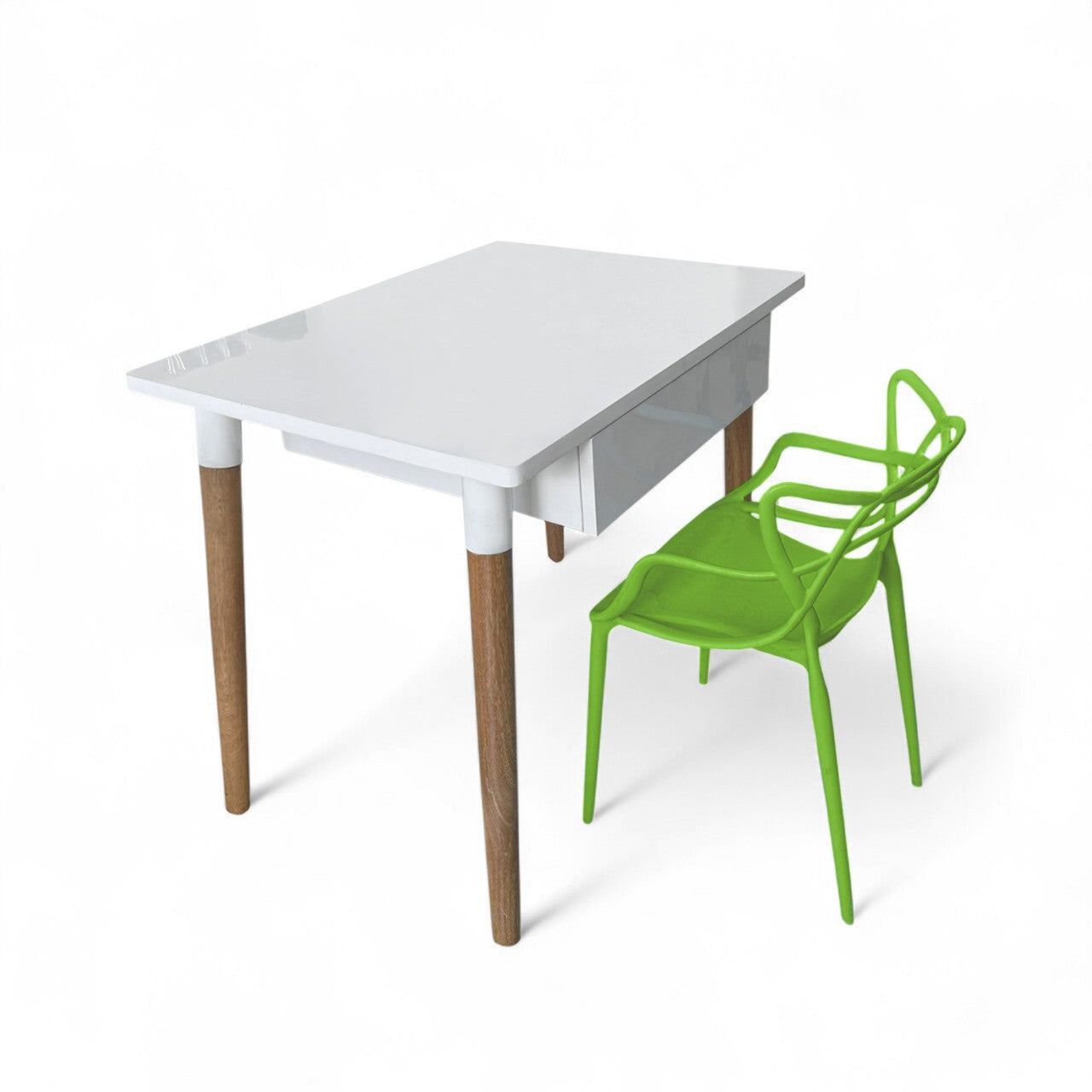 Este moderno escritorio infantil está pensado para ofrecer confort, estilo y funcionalidad a los espacios de estudio de los más pequeños. Su superficie en MDF enchapado en formica brillante proporciona un acabado elegante, resistente y fácil de limpiar, ideal para actividades escolares, dibujo o lectura. Incluye un práctico cajón para mantener útiles organizados y patas en madera torneada que le dan firmeza y un toque decorativo. La combinación perfecta la ofrece la Silla Curvas Stream KIDS, diseñada especialmente para niños. Fabricada totalmente en polipropileno (PP) de alto impacto, esta silla ofrece gran resistencia, estabilidad y un diseño ergonómico y liviano. Sus patas, también en PP, garantizan seguridad durante el uso diario, y su fácil limpieza la hace ideal para habitaciones infantiles, salas de juego, guarderías o colegios.