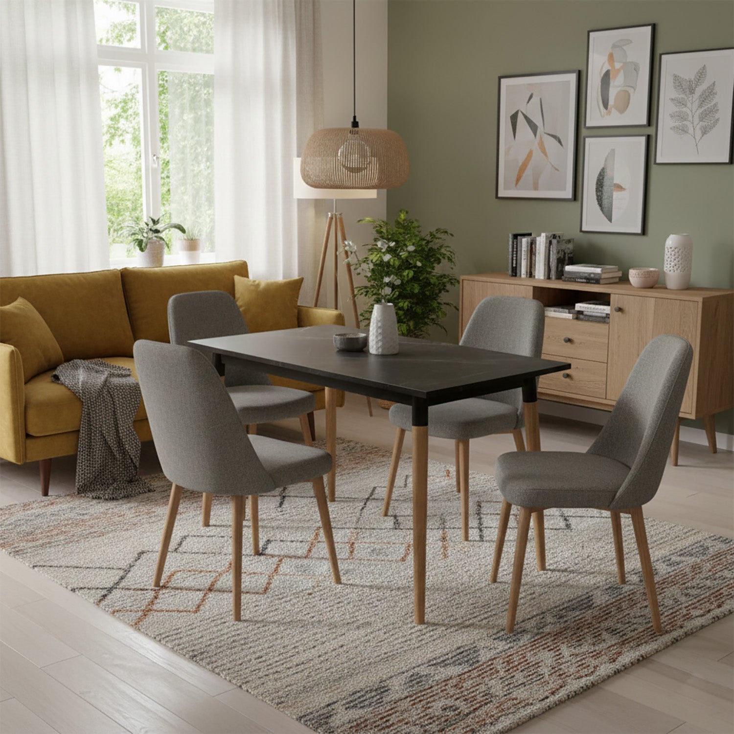 La Mesa de Comedor Haby de 4 puestos combina diseño moderno y funcionalidad, ideal para realzar cualquier espacio. Su superficie en Checua RH negro es resistente a manchas y fácil de limpiar, mientras que las patas de roble aportan durabilidad y una estética cálida.