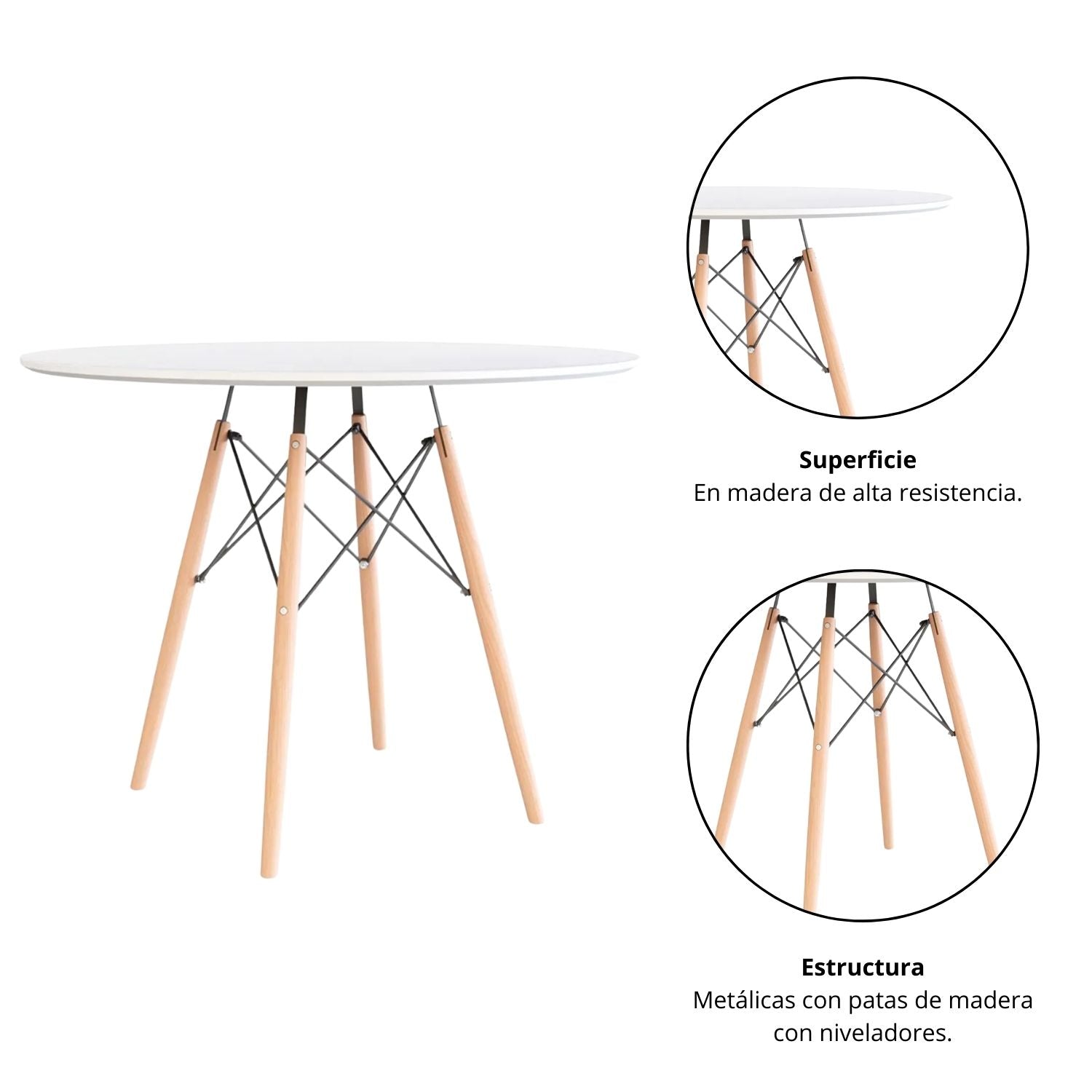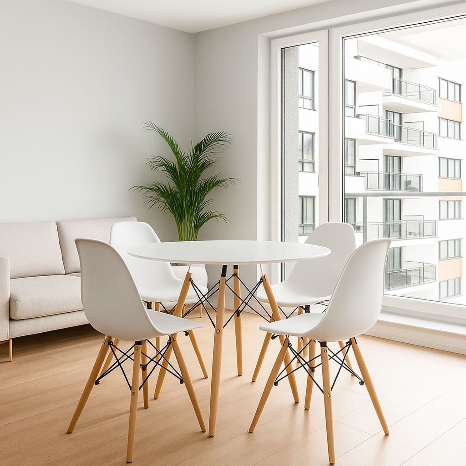La mesa Eames redonda de 100 cm combina diseño moderno y funcionalidad, ideal para comedores, salas o espacios de trabajo. Su superficie en MDF color blanco aporta un estilo minimalista y fácil de integrar en cualquier ambiente.