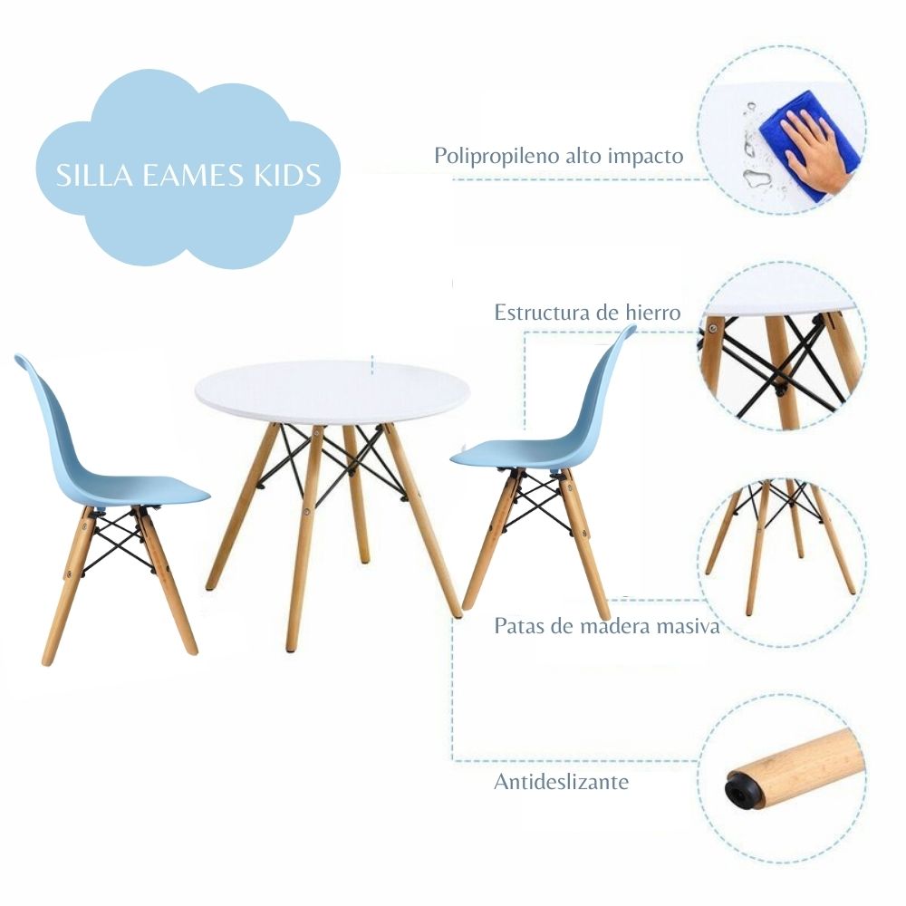 Deja que tus hijos se diviertan dibujando, comiendo y haciendo manualidades sobre esta espectacular Mesa Infantil y Silla Eames infantil ideal para que tus pequeños tengan un lugar donde puedan realizar sus actividades, tareas y hasta jugar. Material de la mesa: Madera MDF laqueada + Estructura de 4 patas en madera con refuerzos metálicos acabado en pintura electrostática negra. Silla eames infantil con asiento y espaldar en polipropileno inyectado. Estructura de 4 patas en madera con refuerzos metálicos acabado en pintura electrostática negra.