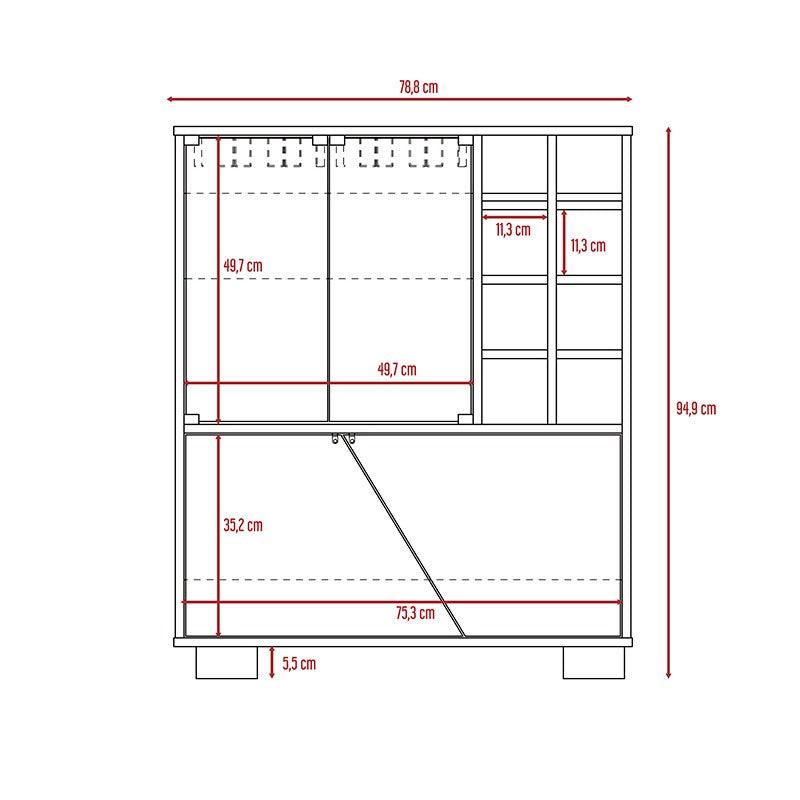 Bar, con 2 puertas batientes, 2 puertas de vidrio, amplio espacio para vino y licores, patas metálicas y combinación de colores.