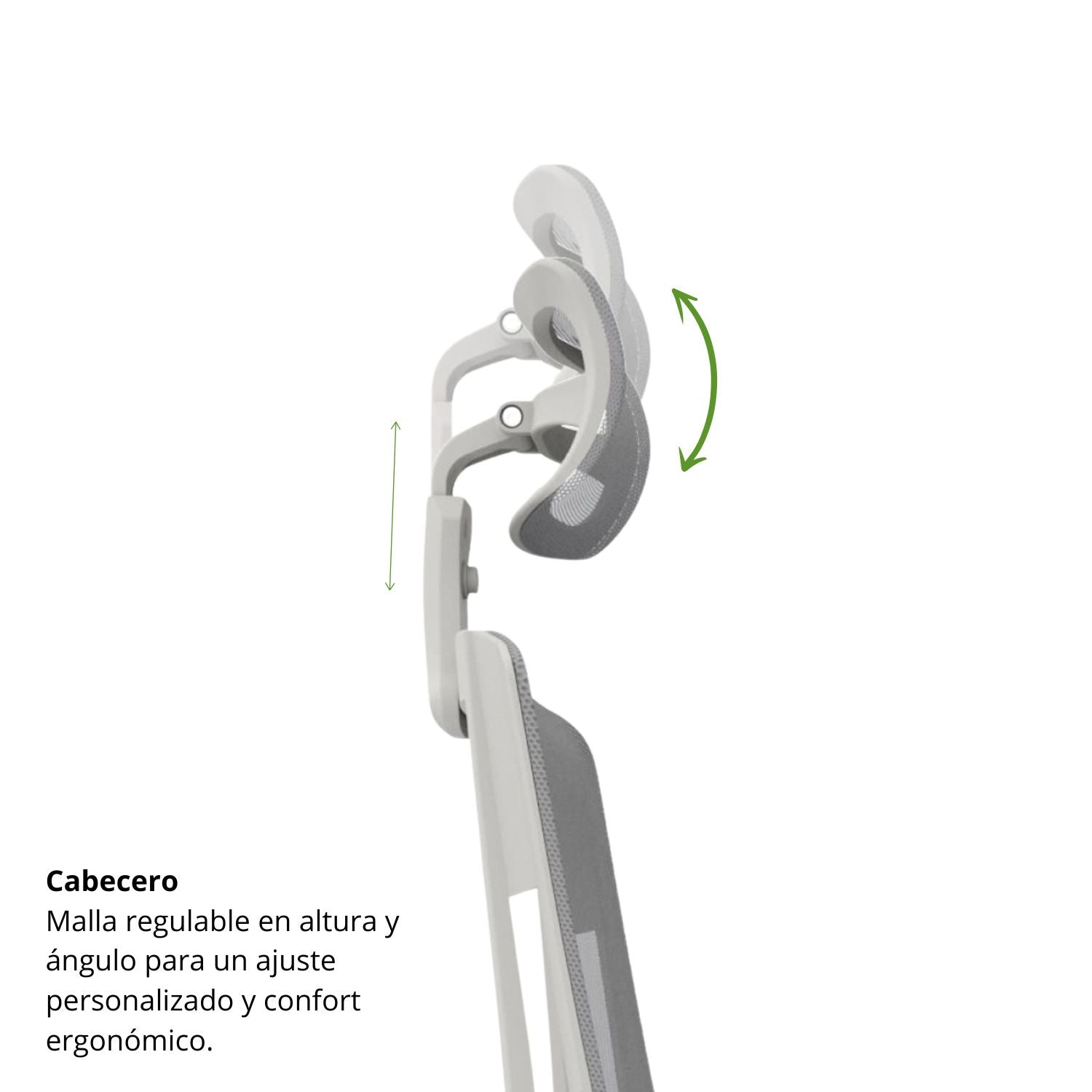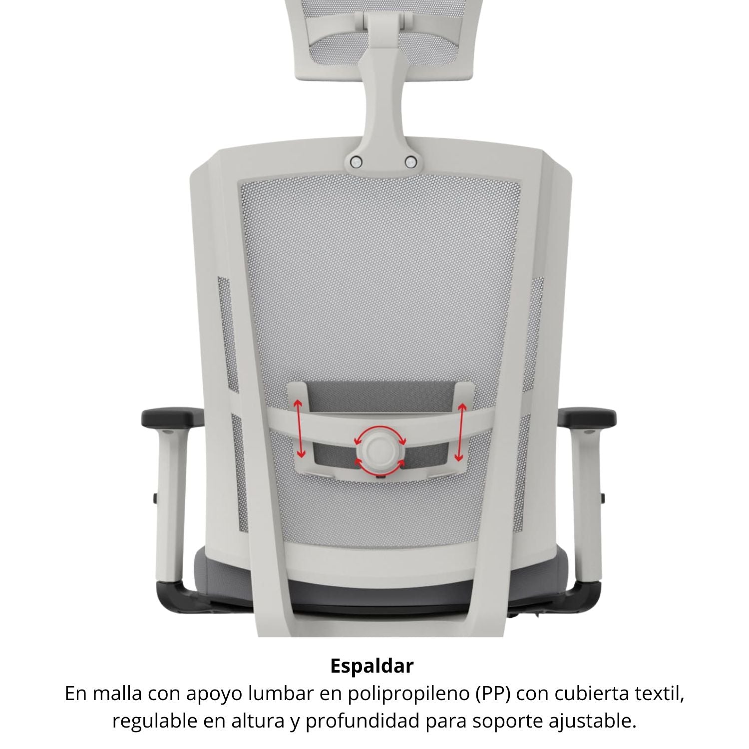 La Silla Cuba Presidente combina un diseño sofisticado con ergonomía avanzada. Incorpora un cabecero en malla regulable en altura y ángulo, junto con un espaldar en malla con apoyo lumbar en polipropileno y cubierta textil, ajustable en altura y profundidad para un soporte preciso.
