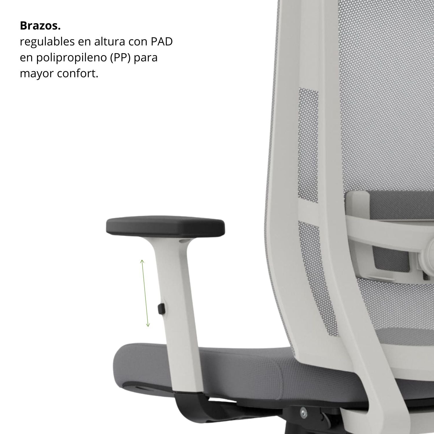 Sus brazos regulables en altura con PAD en polipropileno, más el asiento en espuma laminada tapizado en textil, garantizan confort durante largas jornadas. Además, cuenta con un mecanismo basculante con perilla de tensión, base de 320 mm y ruedas de goma, ofreciendo estabilidad, movilidad y comodidad en un solo diseño.