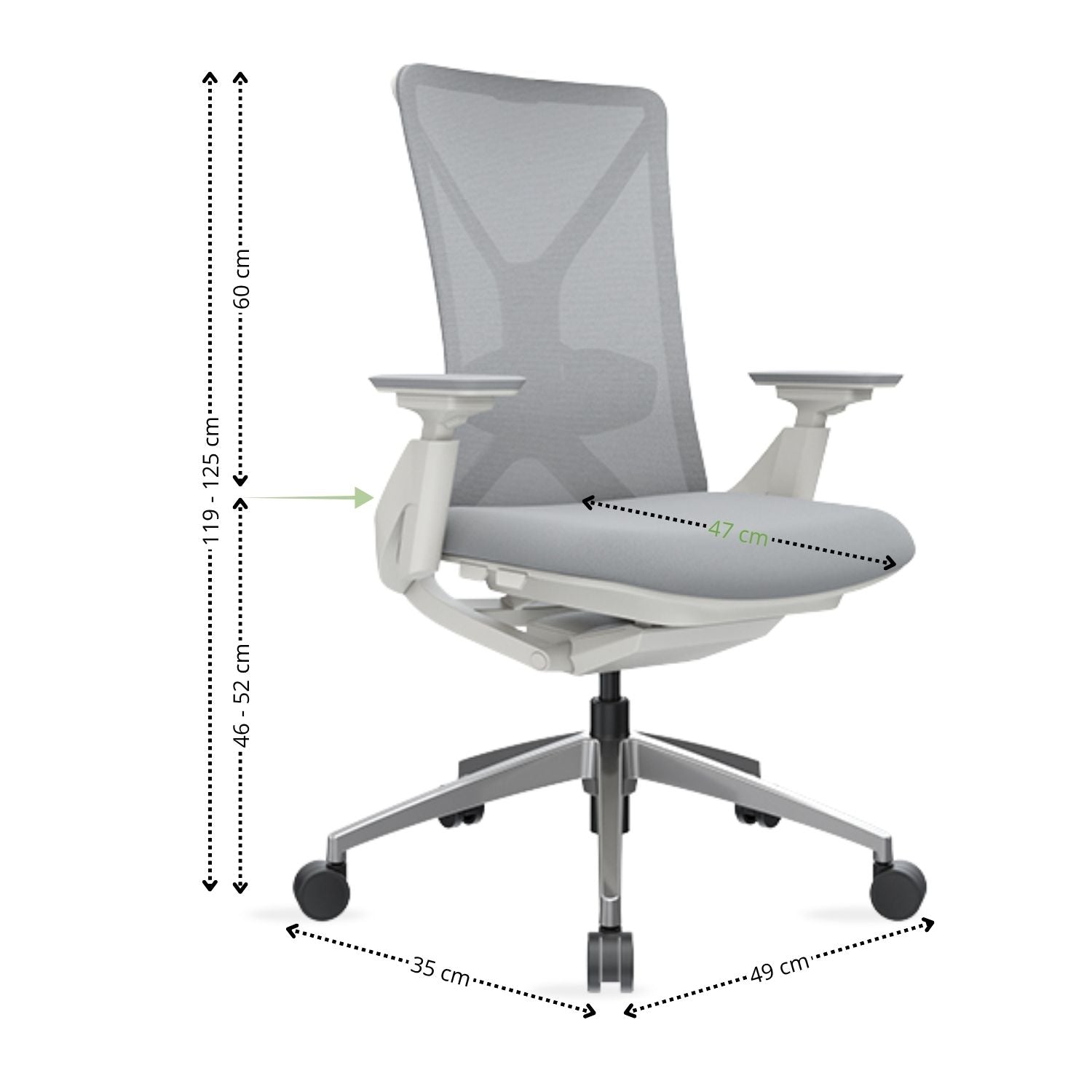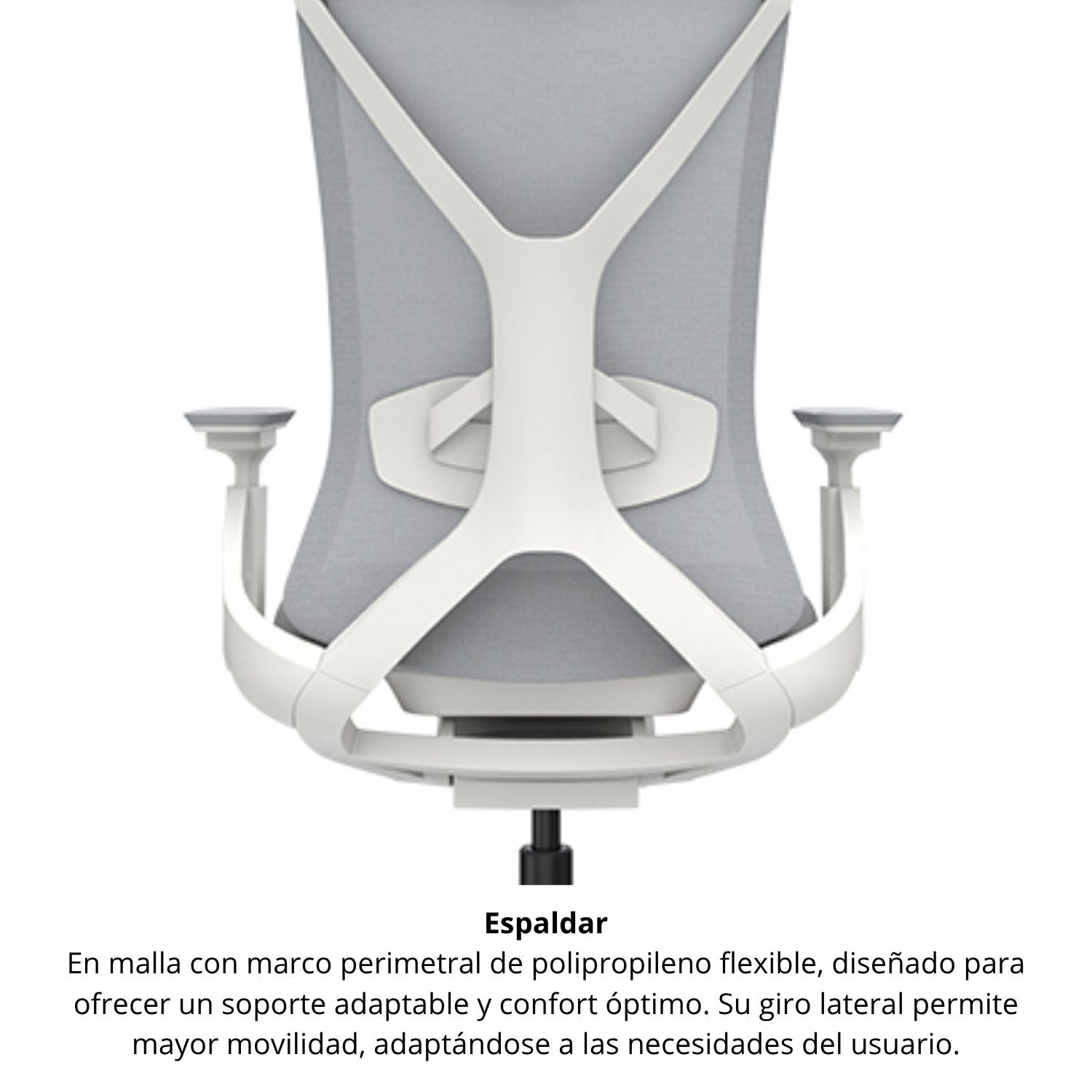 Silla ergonómica ejecutiva. Diseñada para ofrecer confort y soporte durante toda la jornada. Su espaldar en malla transpirable con marco flexible de polipropileno brinda frescura y libertad de movimiento, mientras que el apoyo lumbar graduable se ajusta a la altura del usuario para un soporte óptimo.