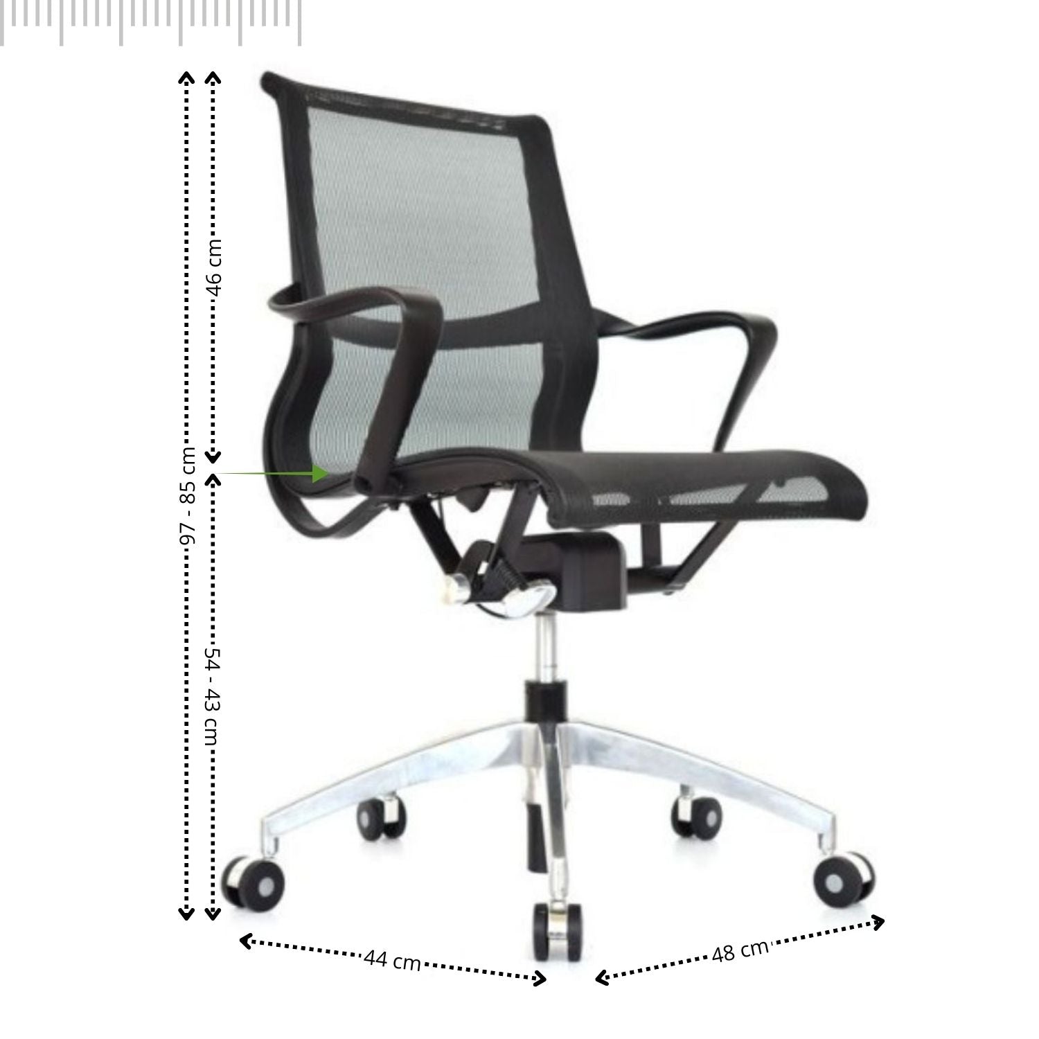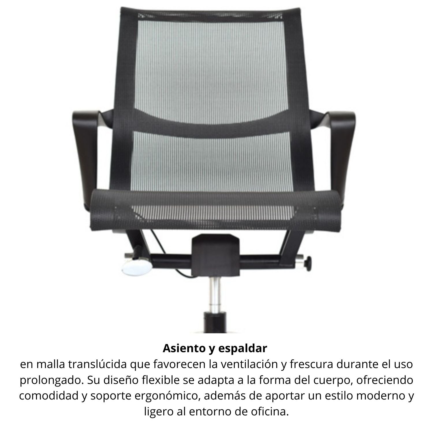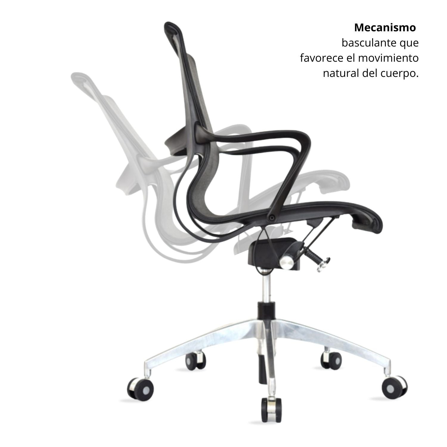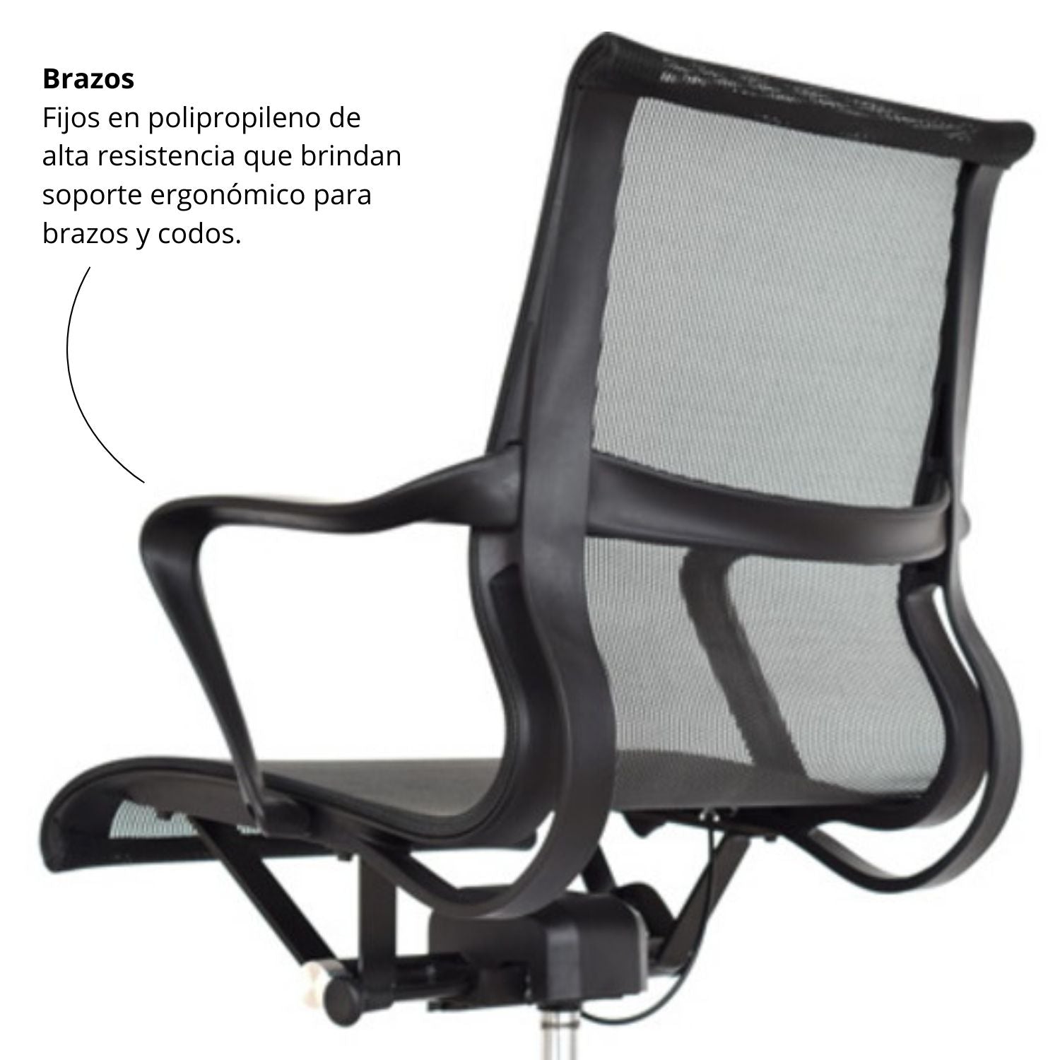 La silla de diseño contemporáneo combina estilo, ergonomía y comodidad, con un espaldar en nylon inyectado tapizado en malla tensada y asiento en malla de nylon que favorecen la ventilación. Su mecanismo basculante con bloqueo a 90° permite un ajuste práctico, mientras que la base de aluminio de 64 cm y las ruedas de nylon de 55 mm aseguran estabilidad y desplazamiento silencioso. Los brazos fijos en nylon brindan soporte adicional, convirtiéndola en una opción ideal para espacios de trabajo y reuniones.