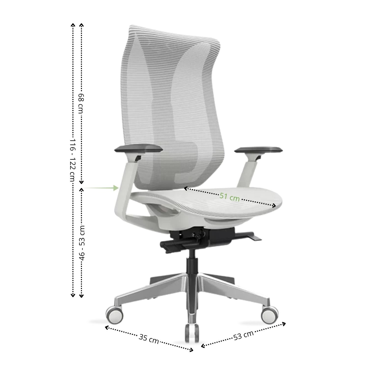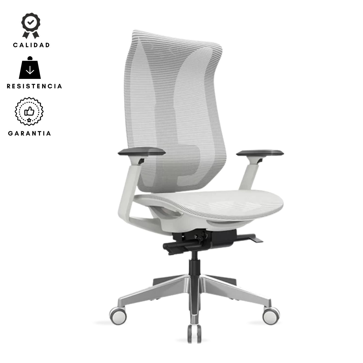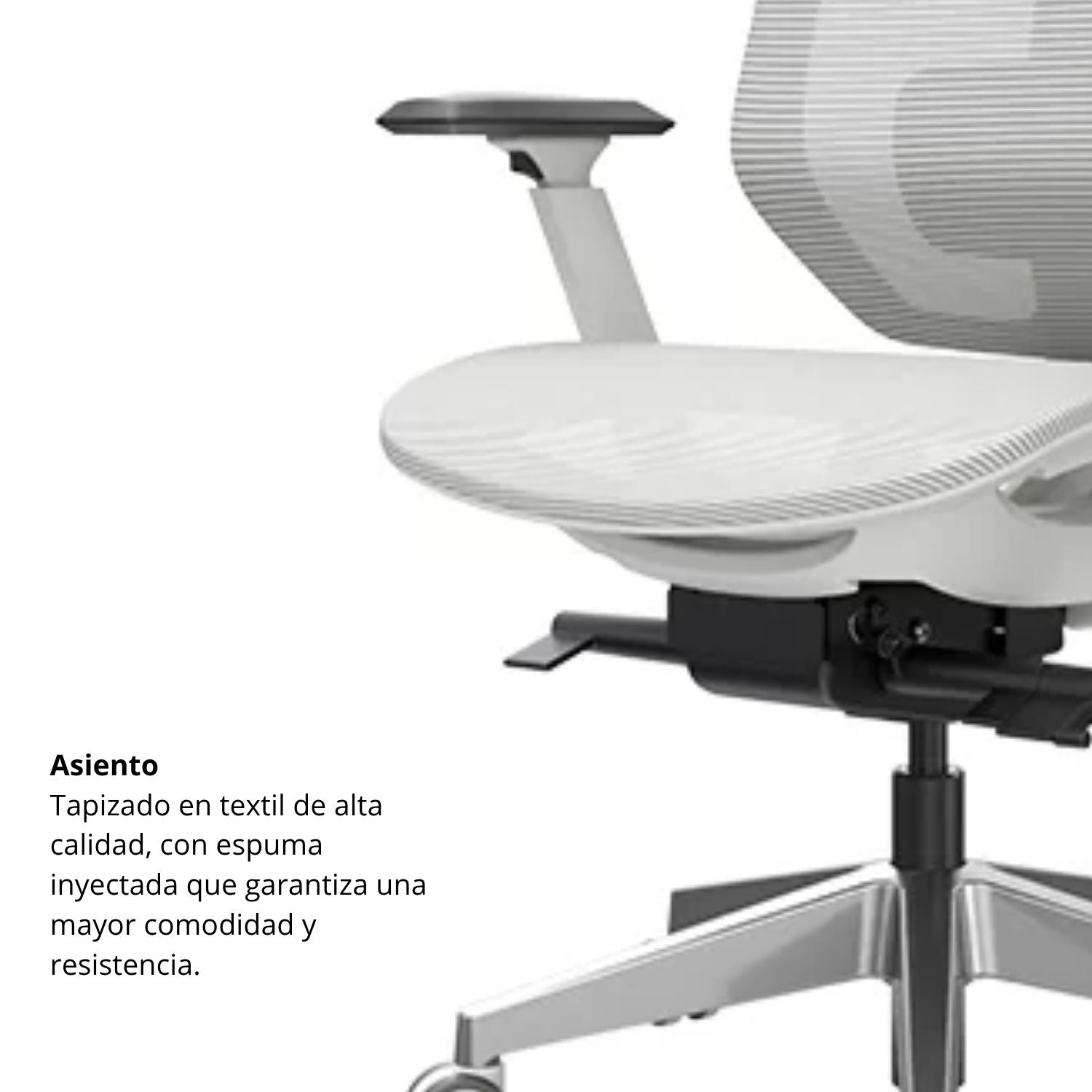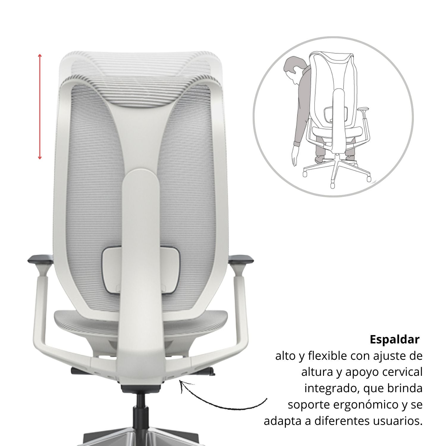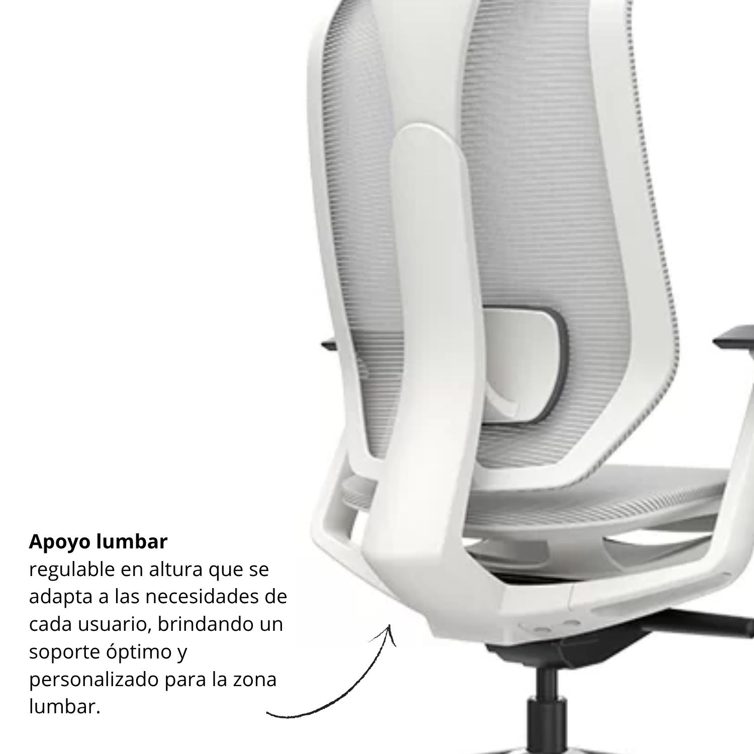 Silla ergonómica giratoria con espaldar alto y ajuste de altura mediante sistema up & down, acompañada de un apoyo cervical para mayor confort. Incluye apoyo lumbar regulable en altura, brazos 3D con PAD en poliuretano (PU) y asiento en malla transpirable.