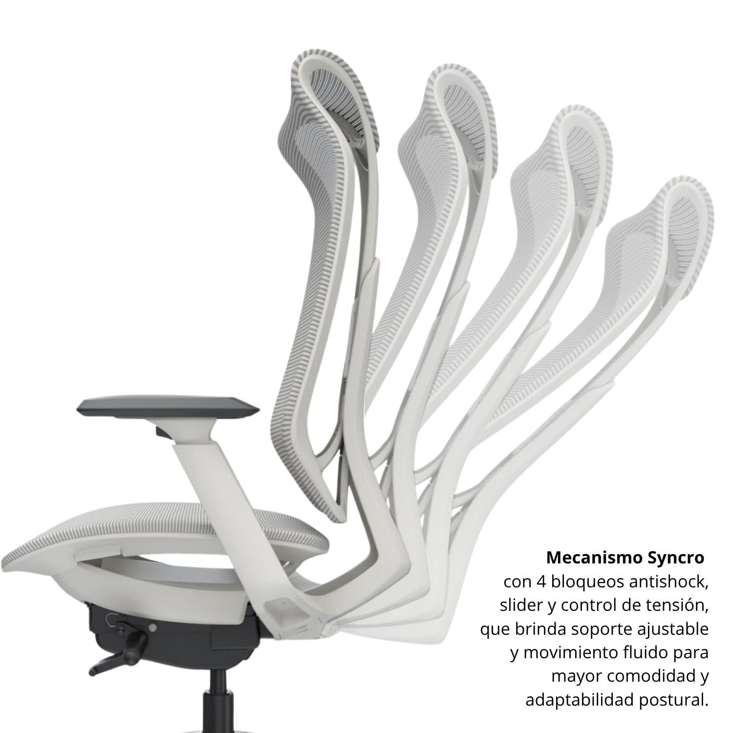 Cuenta con mecanismo Syncro con 4 bloqueos, slider, sistema antishock y control de tensión. Base de aluminio de 350 mm con ruedas en goma (PU) de 60 mm, que ofrecen desplazamiento suave y silencioso.