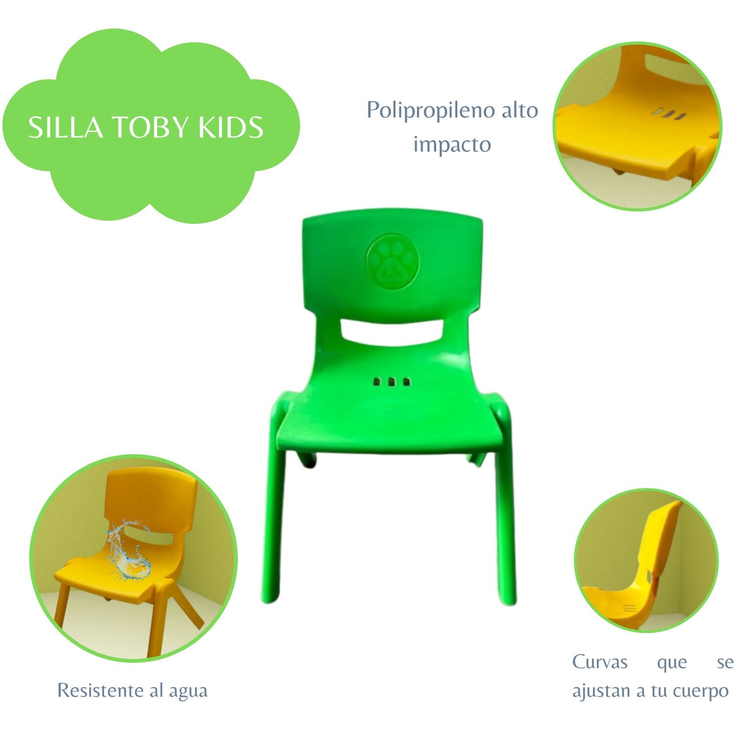 La silla infantil Toby es una opción divertida, cómoda y saludable para que los más pequeños disfruten de su tiempo en casa realizando actividades como dibujar, pintar o jugar. Este modelo, también conocido como silla Andy, está fabricado totalmente en polipropileno de alto impacto, lo que la hace resistente, liviana y fácil de limpiar. Su estructura y diseño curvo se ajustan ergonómicamente al cuerpo del niño, brindando mayor confort. Además, es resistente al agua y perfecta para uso tanto en interiores como exteriores.