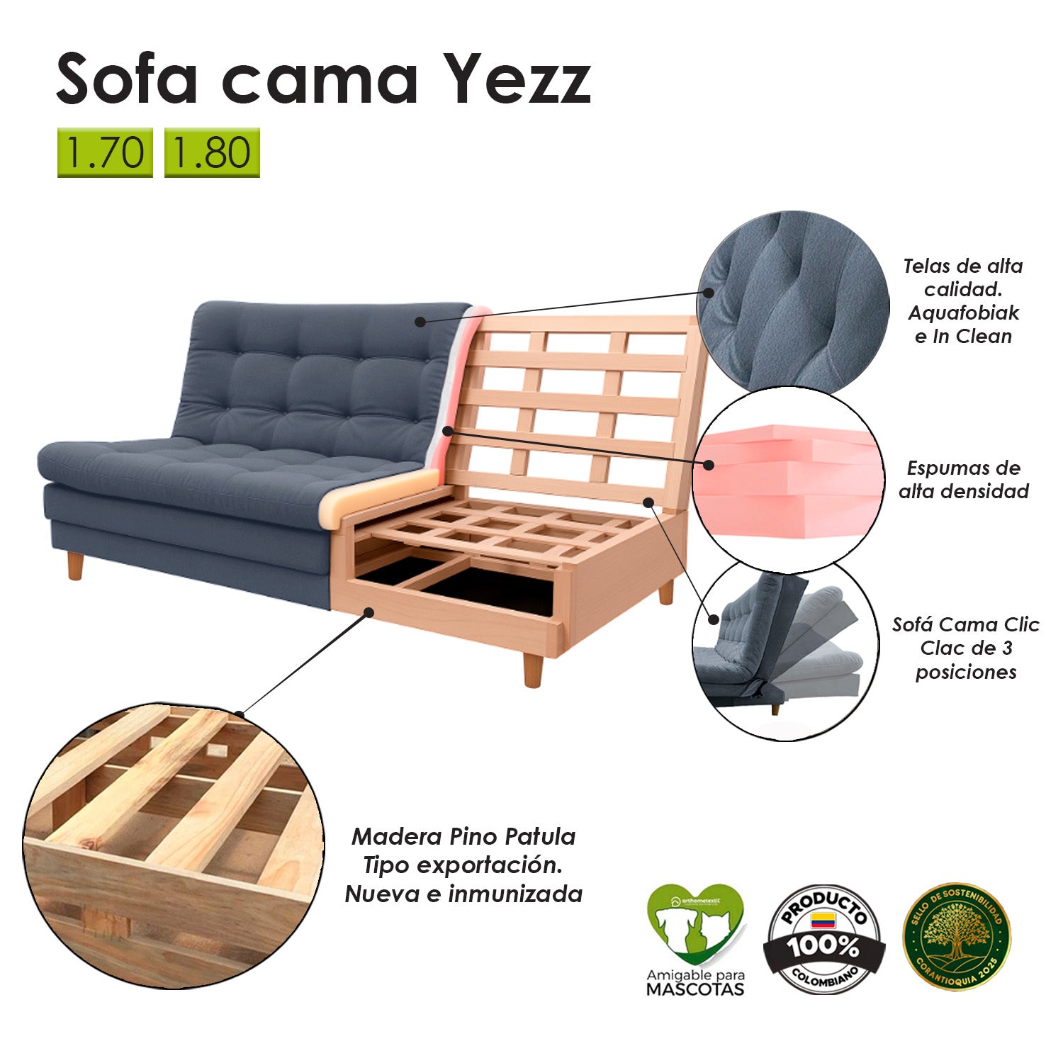El Sofá Cama Clic Clac de 3 posiciones combina versatilidad y estilo, adaptándose a cualquier espacio con sus opciones de sofá, chaise longue y cama. Telas de alta calidad y tecnologías como AquaFobiak e In Clean, que repelen líquidos y facilitan la limpieza. Fabricado con materiales eco-amigables y libres de crueldad animal, sin comprometer el diseño ni la funcionalidad..